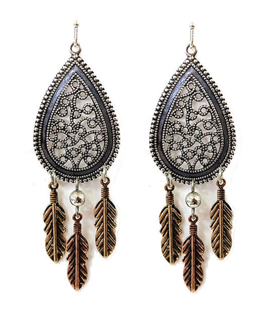 METAL FILIGREE TEARDROP AND FEATHER DROP EARRING