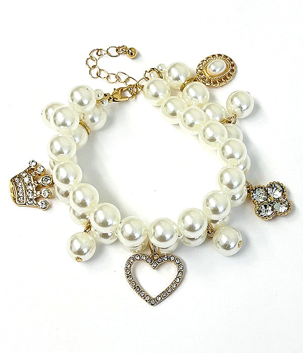 DOUBLE LAYER PEARL CHAIN AND MULTI CHARM BRACELET - HEART CROWN